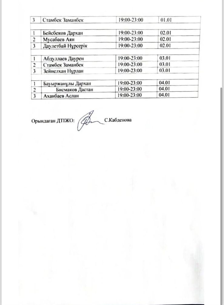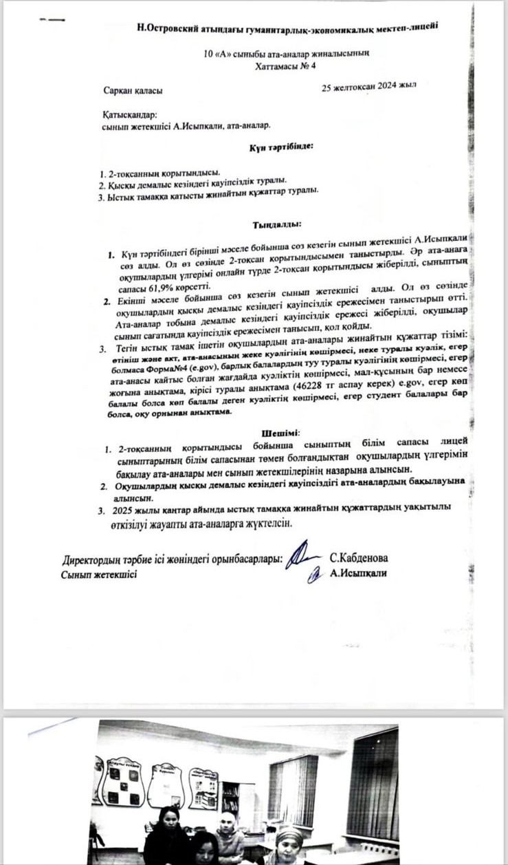Желтоқсан айының 27 жұлдызында барлық сыныптарда ата-аналар жиналысы өткізілді. Жиналыс барысында ҚР Оқу-ағарту министрлігі әзірлеген ҚР жалпы білім беретін мектептердегі оқушылардың мереке күндері және қысқы демалыс кезінде бос уақытын тиімді пайдалануды қамтамасыз ету туралы ұсынымдармен таныстырылды.